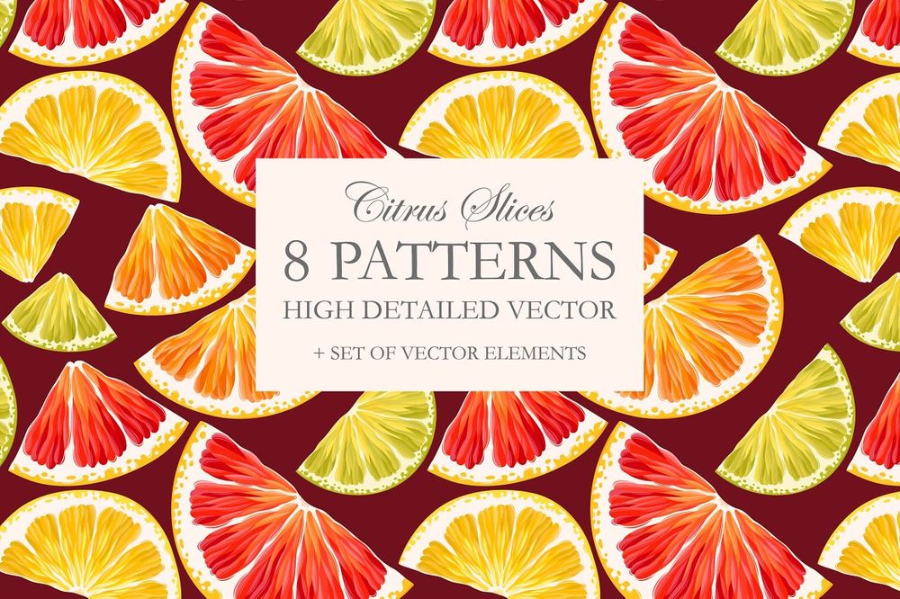 Collection of 8 highly detailed seamless seamless patterns with citrus slices in Adobe Illustrator file. Good for print and digital design such as fabrics, clothing, apparel, fashion, curtains, bedspreads, etc.