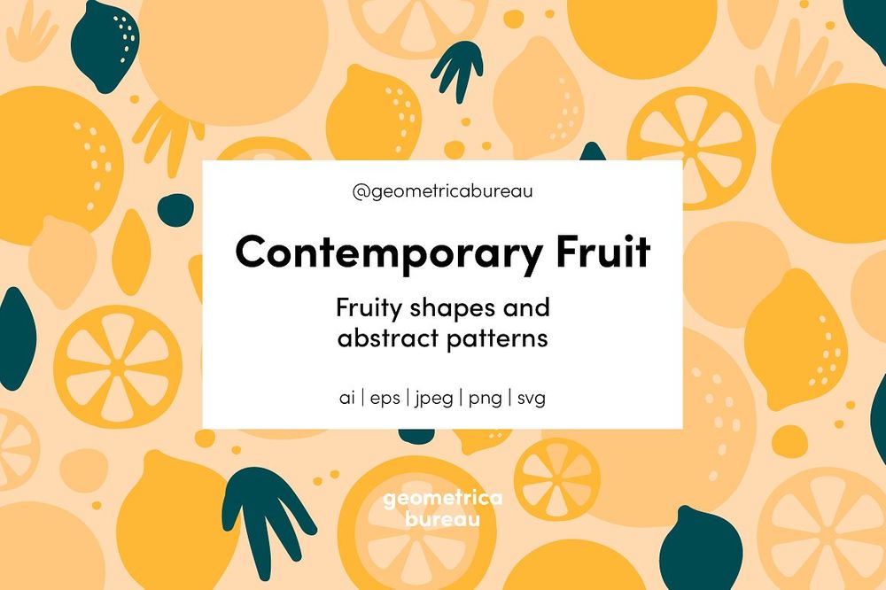 A modern design set of 25 fruit shapes and patterns. Ideal for both print and digital design for apparel, stationery, invitations, branding, websites, textiles, packaging and more.