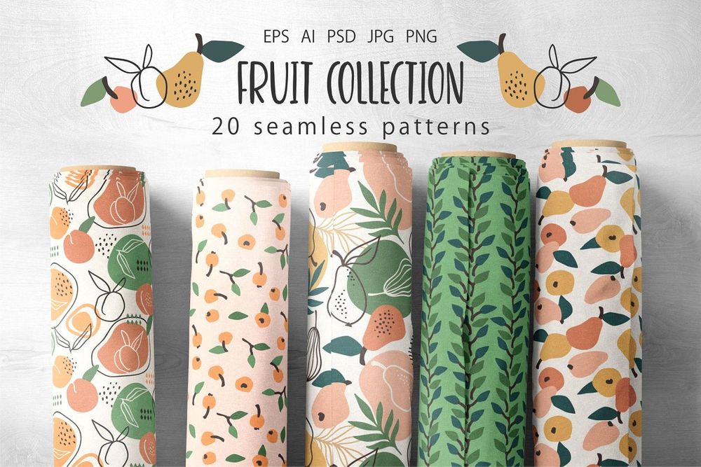 There are 10 seamless patterns and 25 individual fruit elements in this collection. You can use them to create labels for kitchen supplies, stationery, paper products and branding.