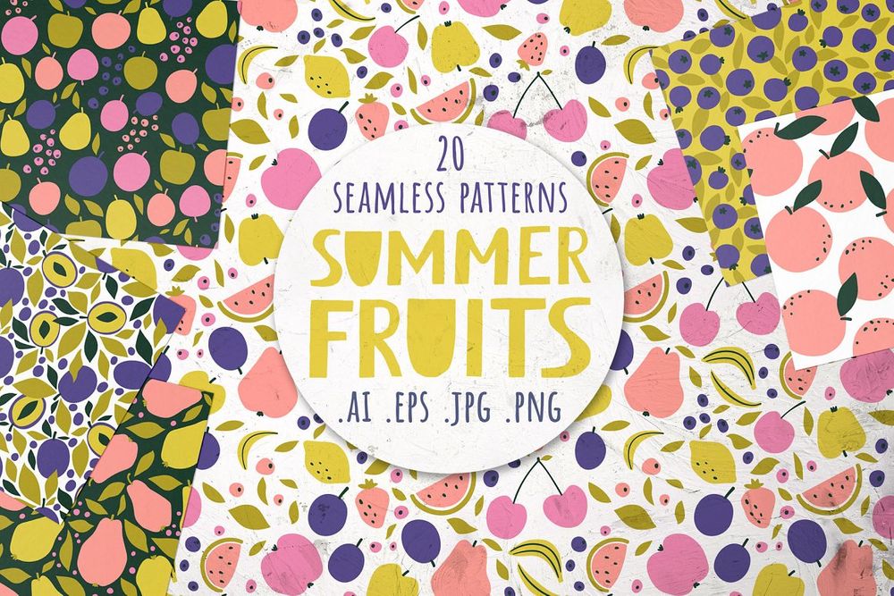 The set contains 20 seamless patterns with summer fruits. These patterns are best for colorful designs such as phone cases, clothing, fashion, packaging and more.