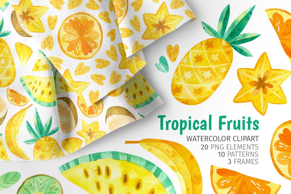 19. Watercolor tropical fruit – seamless patterns and clipart