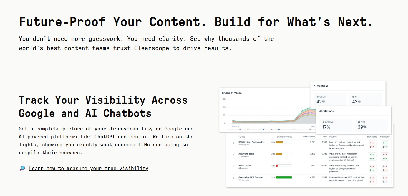 Clearscope is one of the most accurate AI content optimization tools used by top SEO agencies. It focuses on readability, keyword density, and topic coverage to help your content rank naturally.
