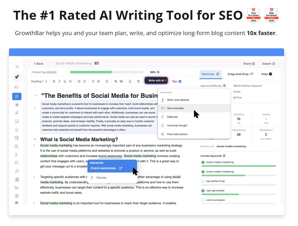 GrowthBar is a Chrome-based AI tool that makes keyword research and content writing easy for beginners. Its real-time optimization tips help you refine content as you type.