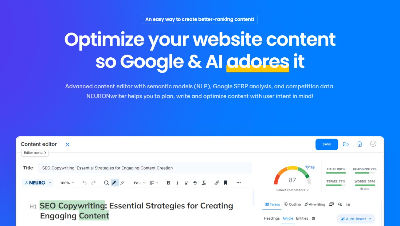 NeuronWriter uses semantic SEO and AI to help you rank higher. It analyzes top-ranking pages for your keywords and gives detailed optimization scores.