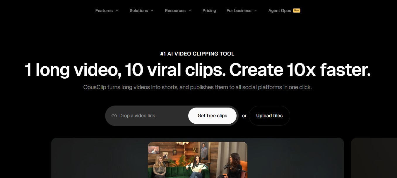 OpusClip automatically transforms long videos into short, viral-ready clips. It uses AI to identify engaging moments, add captions, and reformat the video for TikTok, Reels, or YouTube Shorts.